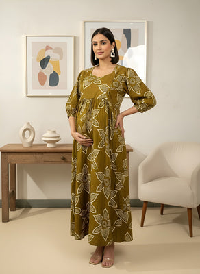 Green Cotton Floral Print Gathered Or Pleated Materinty Dress