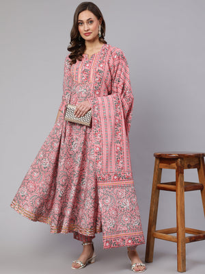 Cotton Printed Ankle Length Flared Round Neck Kurta, Pants With Dupatta Set