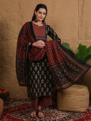 Cotton Calf Length Printed Flared 3/4 Sleeves V-Neck Kurta Bottom Dupatta Set
