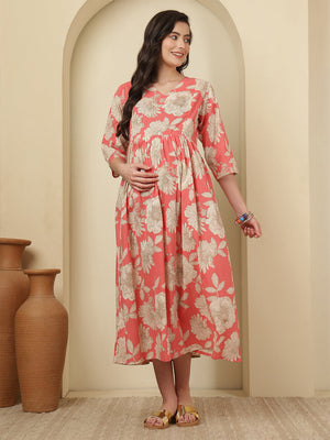 Plus Size Pestel Pink Ethnic Printed Cotton Flared Dress