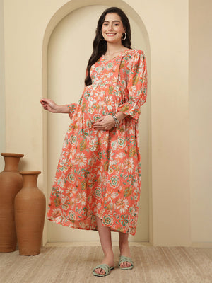 Cotton Ankle Length Printed 3/4 Sleeves Round Neck Full Flared Kurta Bottom With Dupatta