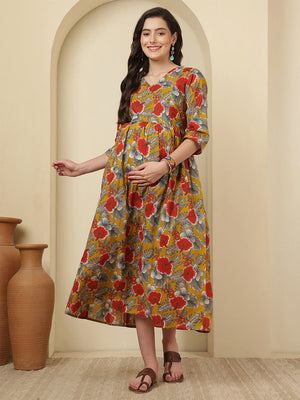 Plus Size Magenta Floral Printed Cotton Flared Dress