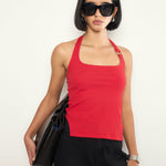 Red Rib Halter Neck With Metal Buckle Top, in Rib fabric, Unlined, Regular Length, Slim Fit, No Closure, Straight Hemline and features Metal Trims Detail At Neck