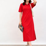 Red Oversized Polo Neck T-Shirt Dress, in Cotton Jersey fabric, Unlined , Midi Length, Oversized Fit, Button Closure, Straight Hemline and features Polo collar Detail