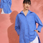 Women Blue Pin Stripe High-Low Oversized Shirt