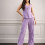 Women Purple Rhombus Neck Top With Cross Pocket Pants