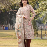 Beige Floral linen A Line Have A Lining Kurta Trouser Dupatta Set