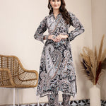 Black Paisley Print Pure Cotton Tunic And Trouser CO-ord Set Kurta design:Paisley Print Tunic A-line shape Shirt Collar,Long sleeve(Cuffed Sleeves) Straight hem with Cotton Lining Top Pure Cotton machine weave, Trouser design:One Pocket Trouser Elasticated waistband Slip-on closure Material & Care Top Fabric Pure Cotton Bottom Fabric Pure Cotton