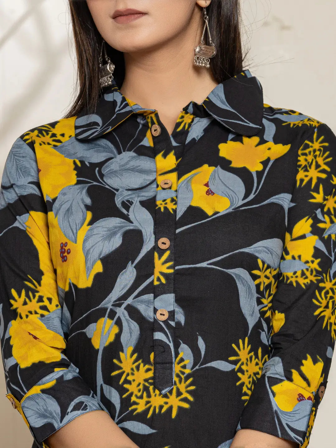 Black, Yellow & Grey Printed Top , has Shirt Collar, Three Quarter sleeves, full placket closure and regular waist hem
