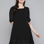 Black Dobby Frill Hem Short Dress, in Swiss Dobby fabric, Polyester Lining, Above Knee, Comfort Fit, No Closure, Flared Hemline and features Frill Detail At Hem