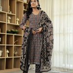 Black Ethnic Motifs A-Line Kurta Trouser Dupatta Set With Bucket Neck