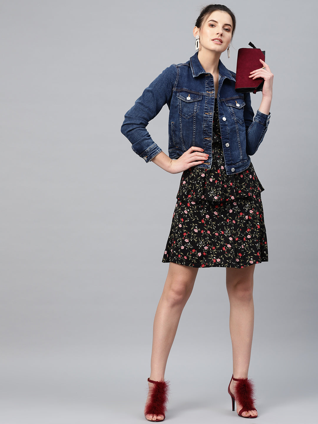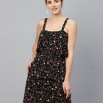 Black Floral Strappy Tiered Dress, in Viscose Jersey fabric, Unlined, Above Knee, Fit & Flare, No Closure, Flared Hemline and features Tiered Pattern