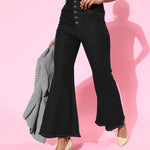 Black Front Button Bell Bottom Jeans, in Denim fabric, Unlined, Full Length, Comfort Fit, Button Closure, Straight Hemline and features Metal Button Detail At Front