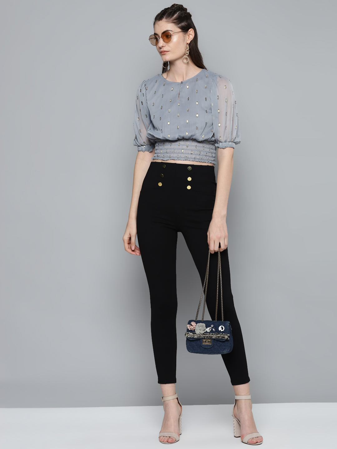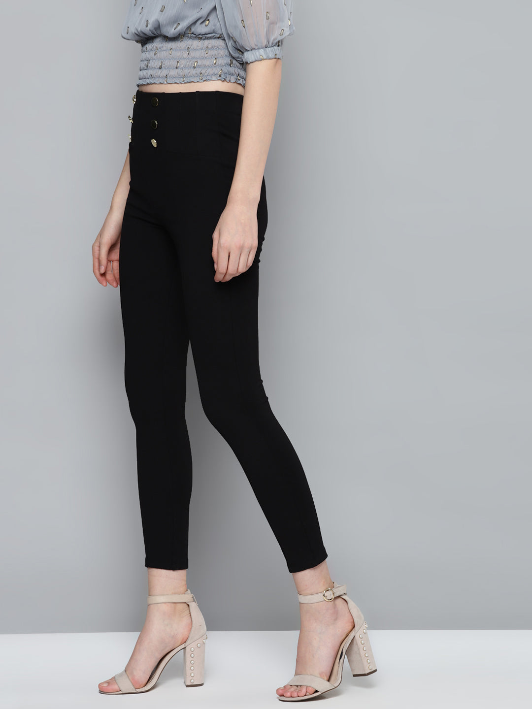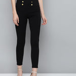 Black Front Button High Waist Jeggings, in Nylon fabric, Unlined, Ankle Length, Comfort Fit, Elasticated Waistline, Straight Hemline and features Bright Gold Button Detail At Front