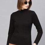 Black High Neck Rib Top, in Flat Rib fabric, Unlined, Regular Length, Slim Fit, Zipper Closure, Straight Hemline and features Conceal Zipper Detail On Shoulder
