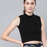Black High Neck Sleeveless Rib Crop Top, in Cotton Rib fabric, Unlined, Crop Length, Comfort Fit, No Closure, Straight Hemline and features High Neck Detail