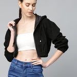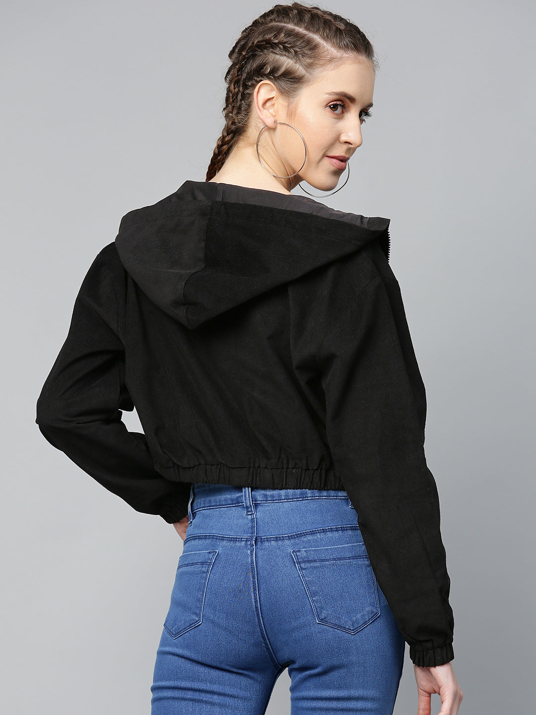 Black Hooded Boxy Corduroy Crop Jacket, in Corduroy fabric, Unlined, Crop, Comfort Fit, Zipper Closure, Straight Hemline and features Hood