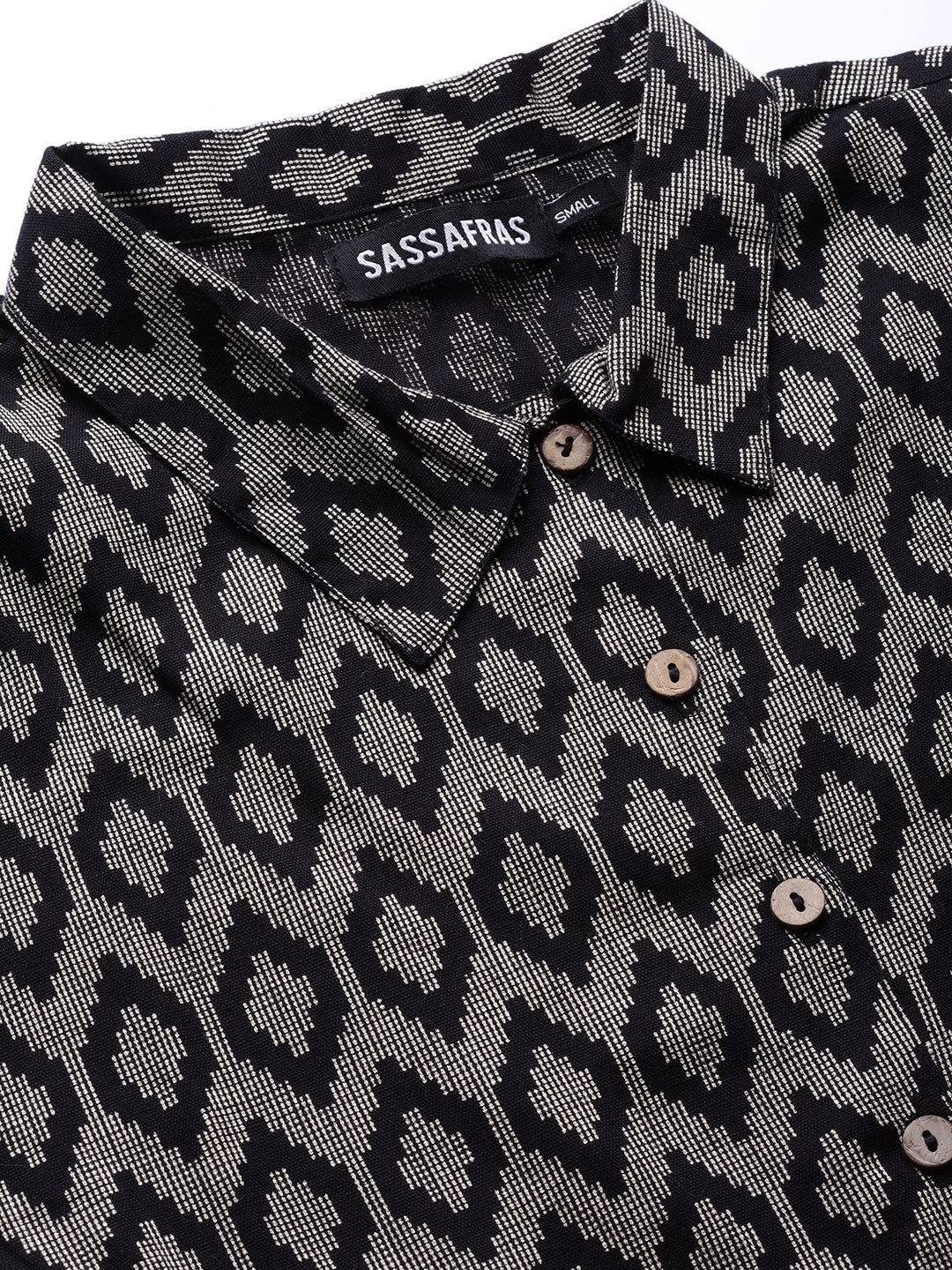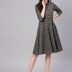 Black Ikat Front Open Belted Dress, in Rayon fabric, Unlined, Below Knee, Fit & Flare, Button Closure, Flared Hemline and features PU Belt On Waist