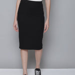 Black Rib Pencil Skirt , in Rib fabric, Unlined, Below Knee, Slim Fit, Elasticated Waistband, Straight Hemline and features Slit At Back