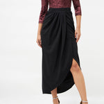 Black Tulip Skirt, in Polyester Spandex fabric, Unlined, Ankle Length, Slim Fit, Elastic At Waist, Asymmetric Hemline and features Wrap Front