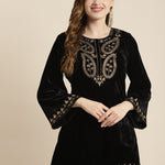 Black Velvet Zari Embroidered Short Kurta, in Velvet fabric, Cotton Lining, Above Knee, Comfort Fit, NA, Straight Hemline and features Zari Embroidery At Front & Sleeve Opening