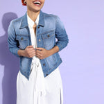 Blue Basic Denim Regular Jacket, in Denim fabric, Unlined, Regular Length, Comfort Fit, Button Closure, Straight Hemline and features Bleach Wash Effect at front