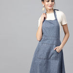 Blue Denim Acid Wash Apron Dress, in Tencel fabric, Unlined, Above Knee, A-Line, Button Closure, Straight Hemline and features Acid Wash Look
