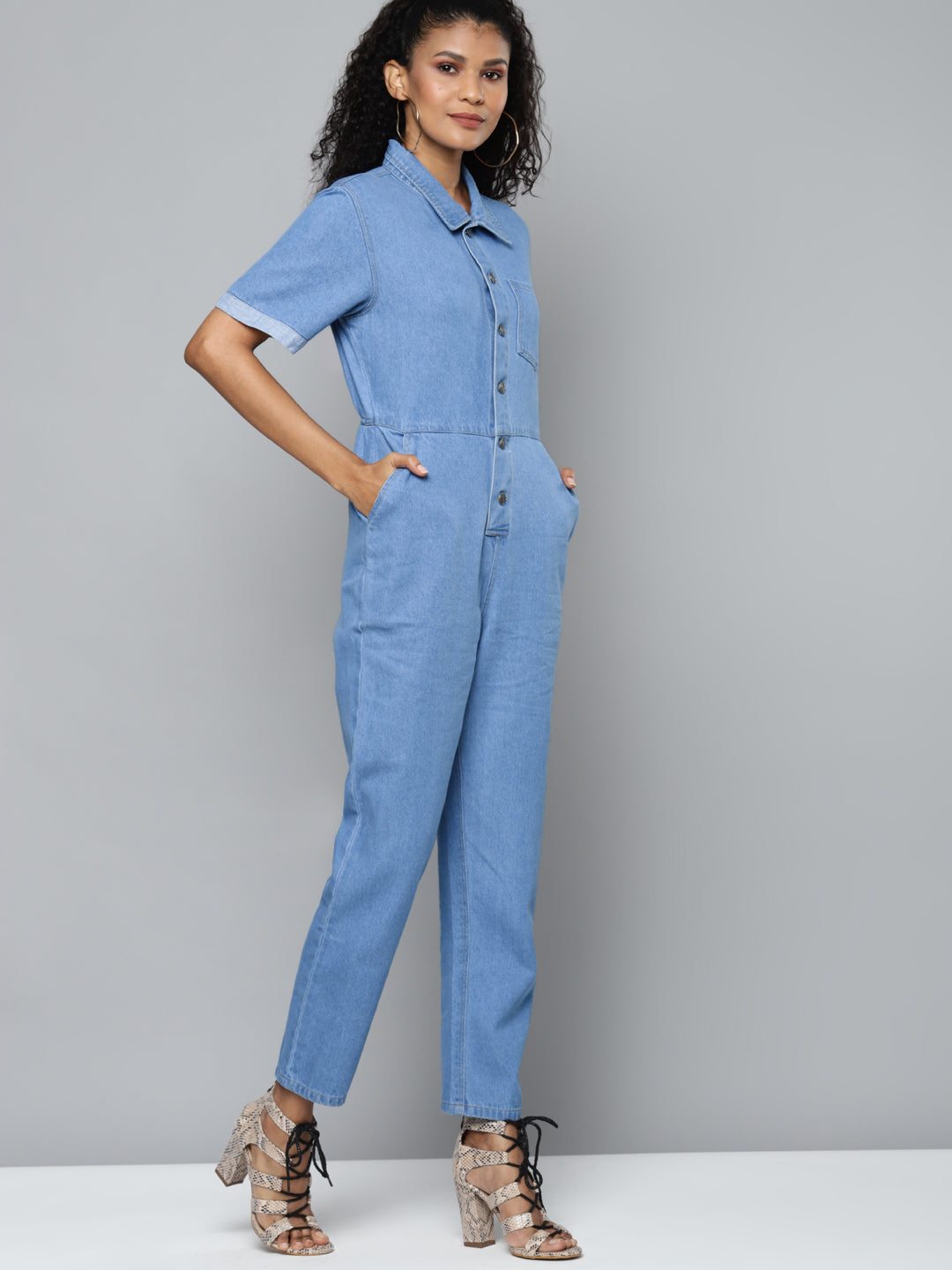 Blue Denim Belted Jumpsuit, in Denim fabric, Unlined, Full Length, Comfort Fit, Button Closure, Straight Hemline and features Button Detail At Front