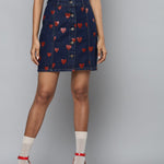 Blue Denim Red Heart Print Mini Skirt, in Denim fabric, Unlined, Above Knee, Comfort Fit, Button Closure, Straight Hemline and features Red Heart Print Detail All Over