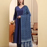 Blue Solid A-line kurta Trouser Dupatta Set kurta Design Maternity A-line Shape Three quarter sleeve V-Neck Calf Length kurta Flared Hem Machine Weave Cotton Trouser Design:One pocket Pure Cotton Trouser Slip-On Waist Size & Fit Material & Care Pure Cotton Dry Clean