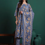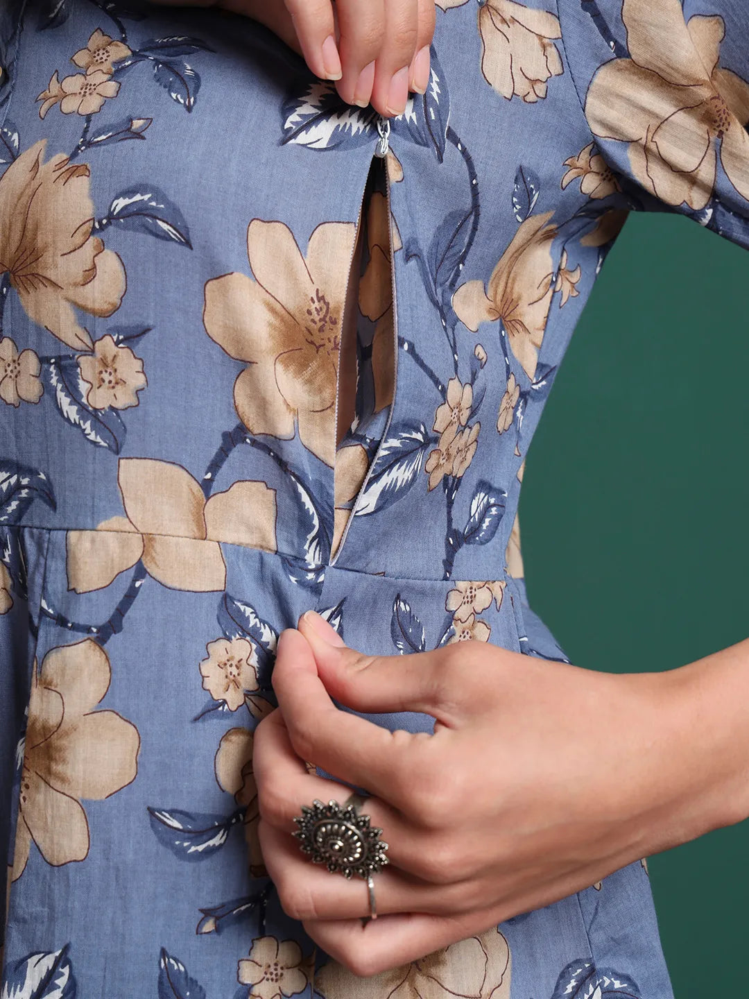 Blue Floral Print Maternity A-Line Kurta Trouser Dupatta Set