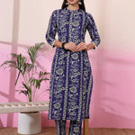 Blue Floral Print Straight kurta Trouser Set Kurta Design Yoke button show Straight Shape Three quarter sleeve(Regular Sleeves) Mandarin Collar Calf Length Kurta Straight Hem Machine Weave Cotton Trouser Design:One pocket Pure Cotton Trouser Slip-On Waist Size & Fit Material & Care Pure Cotton Dry Clean