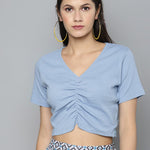 Blue Gather Detail Crop Top, in Cotton Rib fabric, Unlined, Crop Length, Comfort Fit, No Closure, Straight Hemline and features Gather Detail At Front