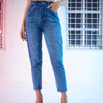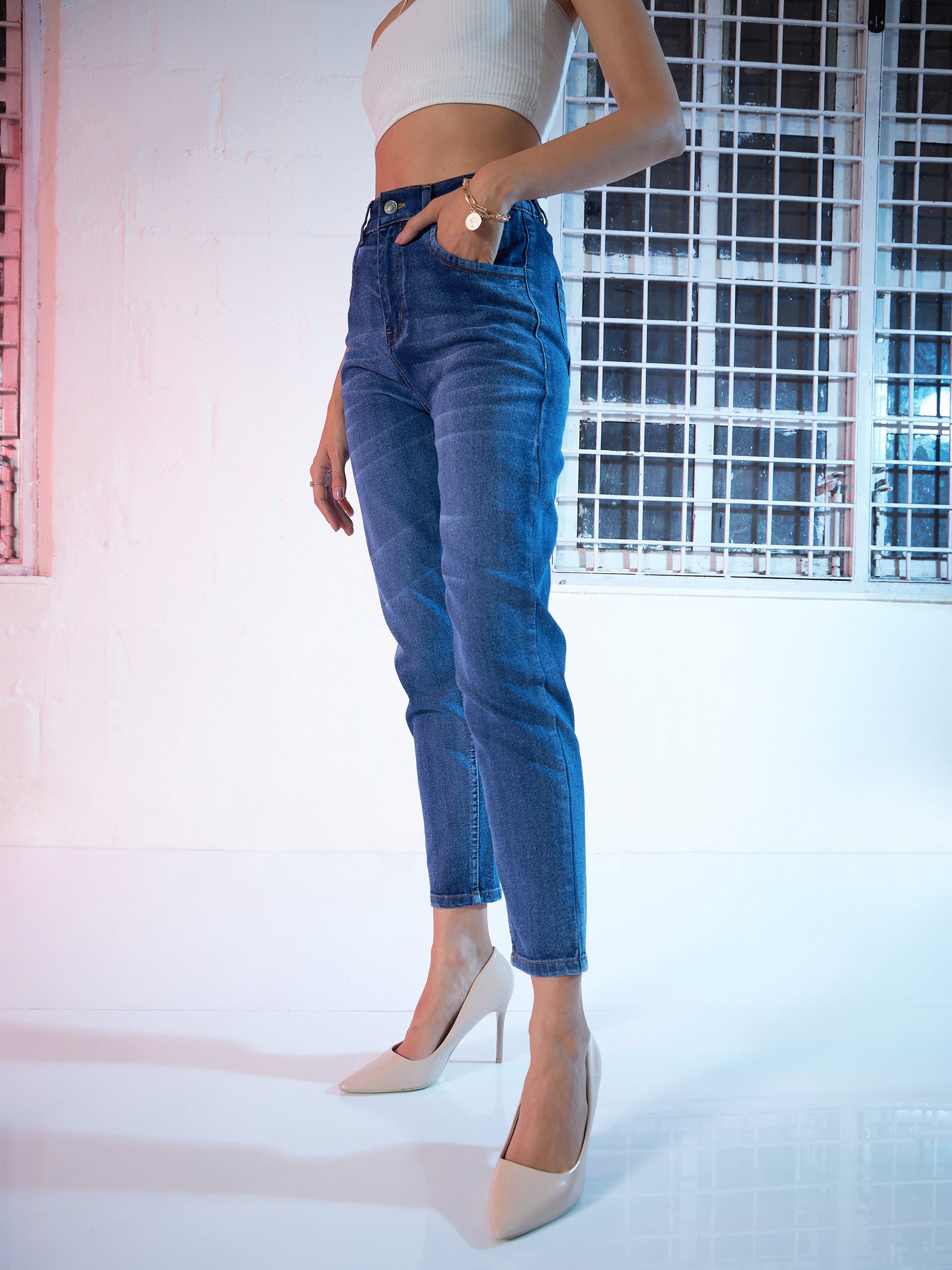 Blue High Waist Basic Jeans, in Denim fabric, Unlined, Full Length , Comfort Fit, Button Closure, Straight Hemline and features Wash Effect At Front
