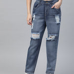 Blue High Waist Distressed Knee Jeans, in Denim fabric, Unlined, Full Length , Comfort Fit, Button Closure, Straight Hemline and features Distress Detail At Knee