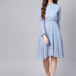 Blue Mandrain Collar Pleated Skater Dress, in Georgette fabric, Polyester Lining, Above Knee, Fit And Flare, Button Closure, Flared Hemline and features Pleated At Skirt Part