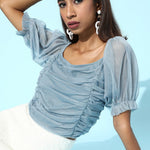 Blue Mesh Lurex Ruched Crop Top, in Mesh Net fabric, Polyester Lining, Crop Length, Comfort fit, No Closure, Straight Hemline and features Ruching Detail At Front
