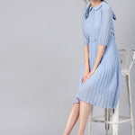Blue Peterpan Pleated Belted Midi Dress, in Georgette fabric, Polyester Lining, Below Knee, Fit And Flare, Button Closure, Flared Hemline and features Pleated Skirt with DTM Buckle Belt On waist