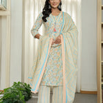 Blue Pure Cotton Floral Print Kurta Dupatta Pant Set