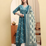 Blue Pure Cotton Thread Work Anarkali Kurta Trouser Dupatta Set