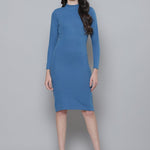 Blue Rib Turtle Neck Zipped Bodycon Dress , in Rib fabric, Unlined, Below Knee, Slim Fit, Zipper Closure, Straight Hemline and features Concealed zipper At Back