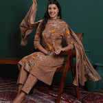 Brown Cotton Floral Print Kantha Work A-Line Kurta Pants Dupatta Set