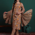 Brown Cotton Floral Print Piping Kurta Pants Dupatta Set