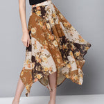 Brown Floral Asymmetric Midi Skirt, in Weightless Georgette fabric, Polyester, Midi Length, Comfort Fit, Elastic Closure, Flared Hemline and features Asymmetric Hemline