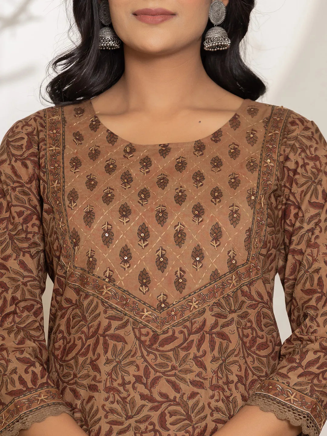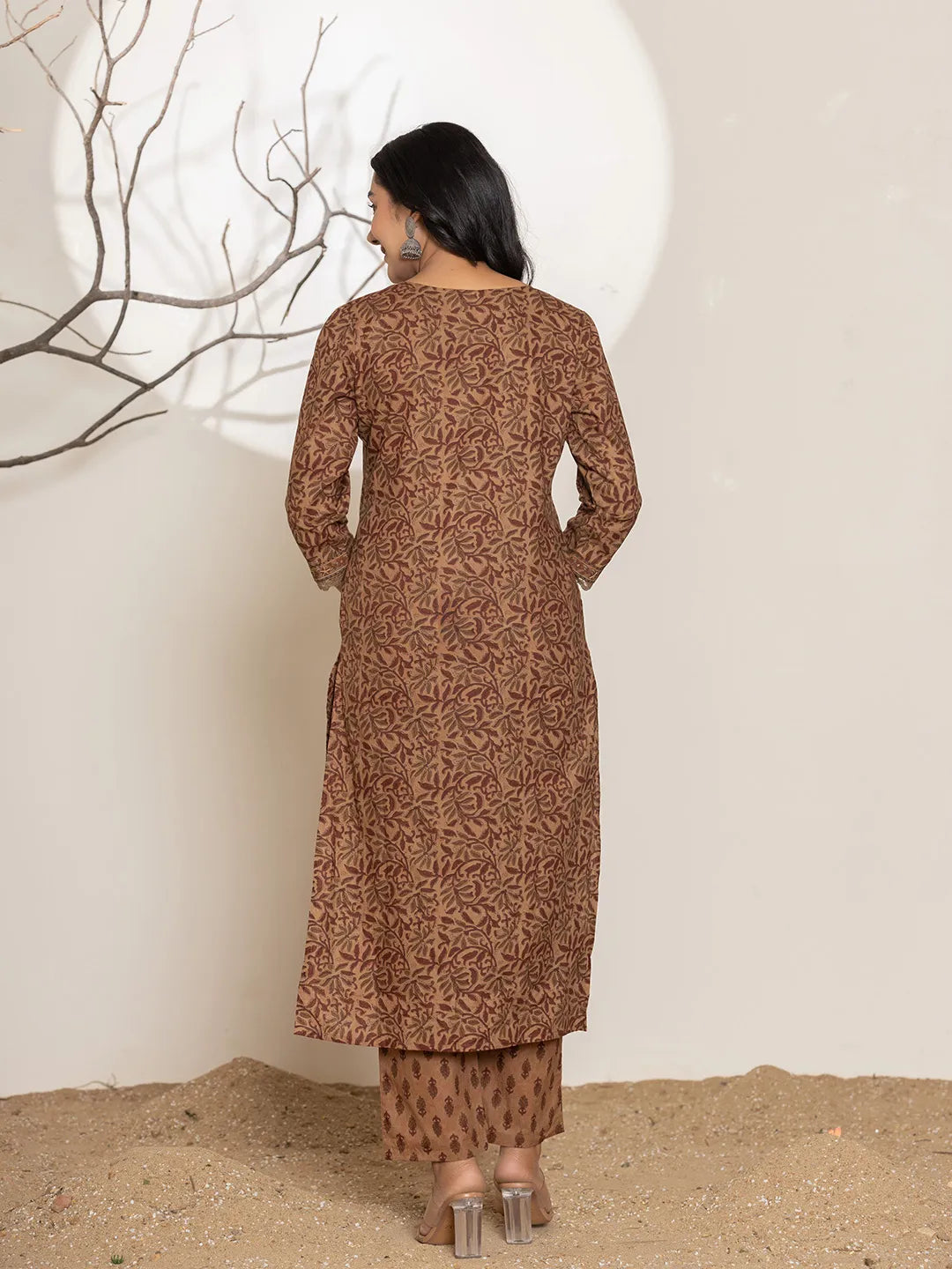 Brown Leaf Print Cotton Straight Kurta Dupatta Set
