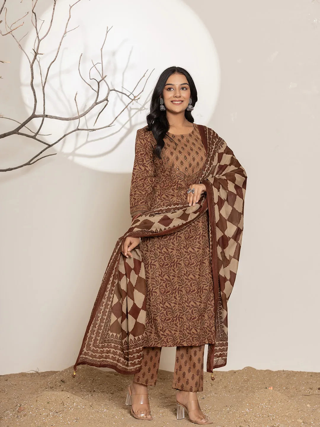 Brown printed Kurta with Trousers with dupatta