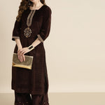 Brown Velvet Zari Embroidered Straight Kurta