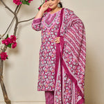 Burgundy And Grey Cotton Floral Print Lace Work Plus Size Kurta Pants Dupatta Set