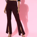 Burgundy Roma Front Slit Bell Bottom Pants, in Nylon fabric, Unlined, Full Length, Comfort Fit, No Closure, Straight Hemline and features Slit At Front