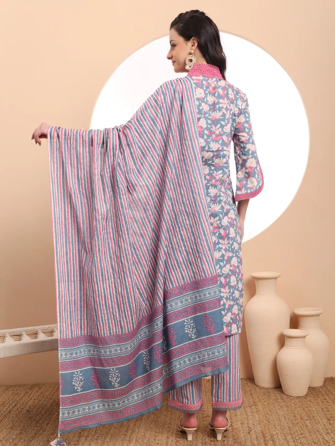 Cotton Blue Kurta Dupatta Set With Lace Detailing
